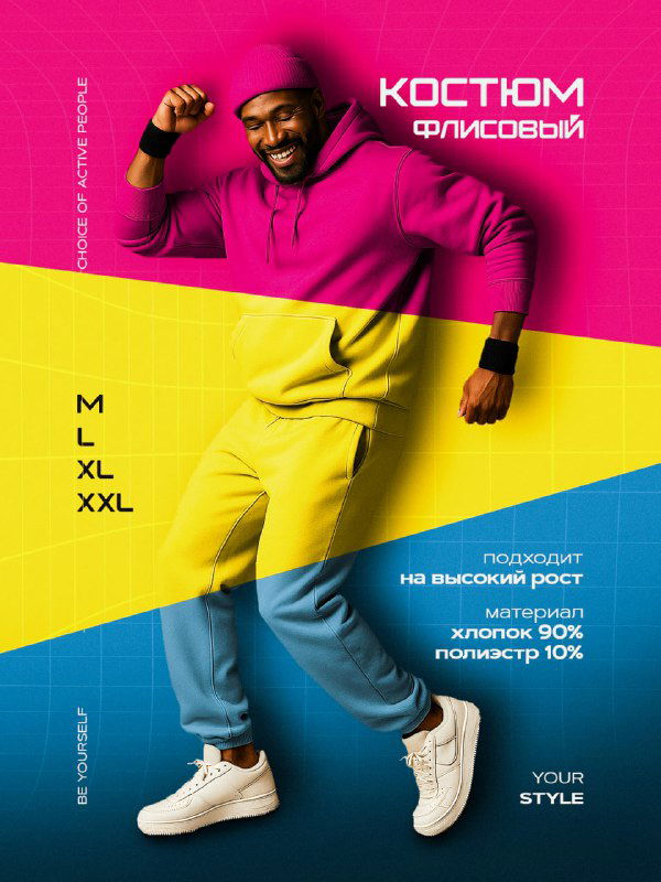Вот пример, как можно сыграть на цвете и форме: один и тот же флисовый костюм — но на макете он «разделён» диагоналями на три яркие части, каждая — свой вариант цвета.