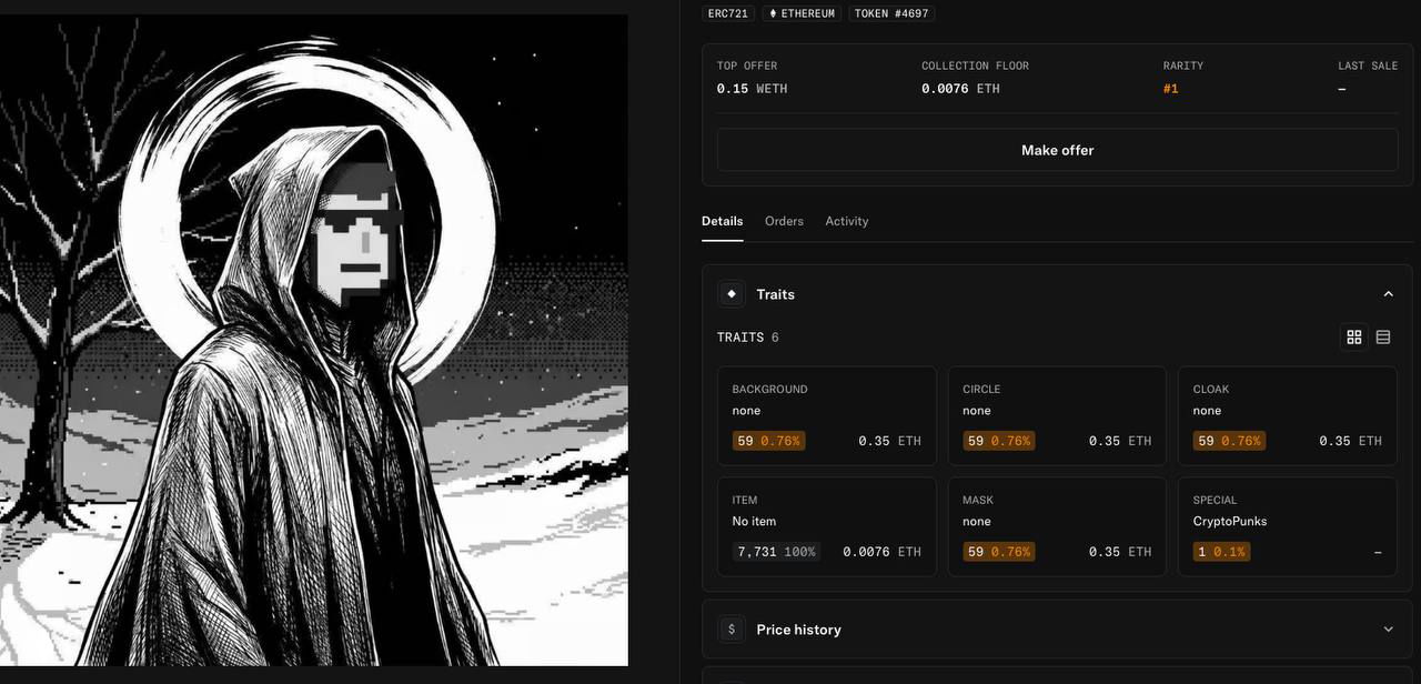 Перед нами редчайший экземпляр коллекции Digital Mr. Freeman, занимавший #1 по редкости. NFT #4731 соединяет в себе два культа цифровой эпохи: иконического Mr. Freeman символ внутреннего пробуждения и цифрового анархизма, и CryptoPunks, как архетип зарождения NFT-сцены.
