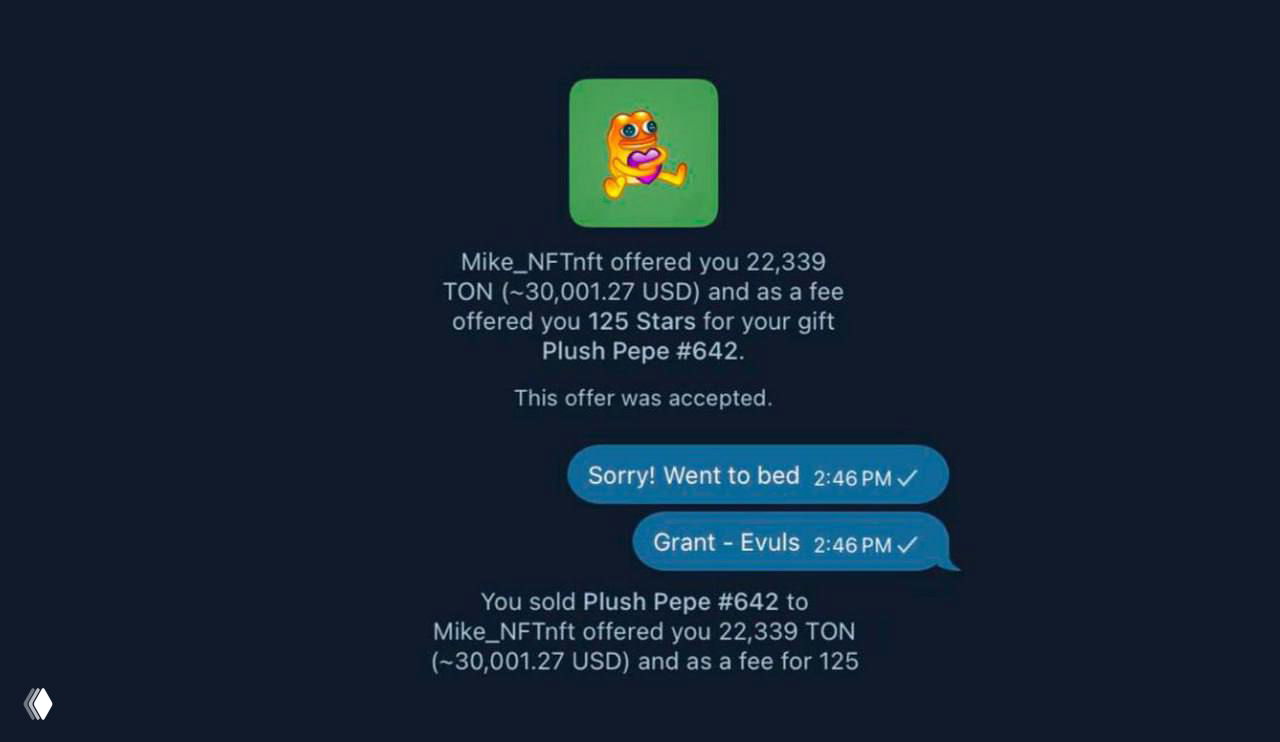 На самом деле оффер был всего 125 Stars (≈ 1.88 $). Пользователь принял его и передал PlushPepe-642, потеряв подарок.