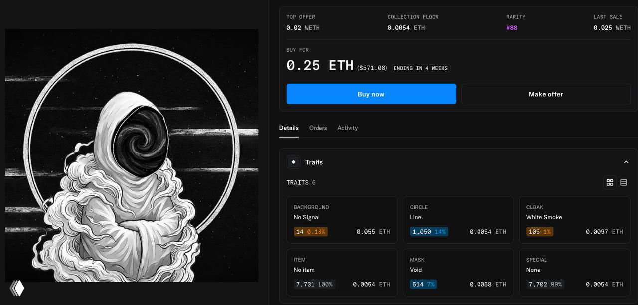 При том, что последний раз этот номер уходил всего за 0.025 WETH, реальная справедливая оценка для такого набора трейтов выглядит ближе к 0.06–0.1 ETH, то есть примерно 150-250 долларов. Это всё ещё ощутимая надбавка к floor, логичная для редкого фона и плаща, но без ощущения, что с тебя пытаются взять налог на жадность.