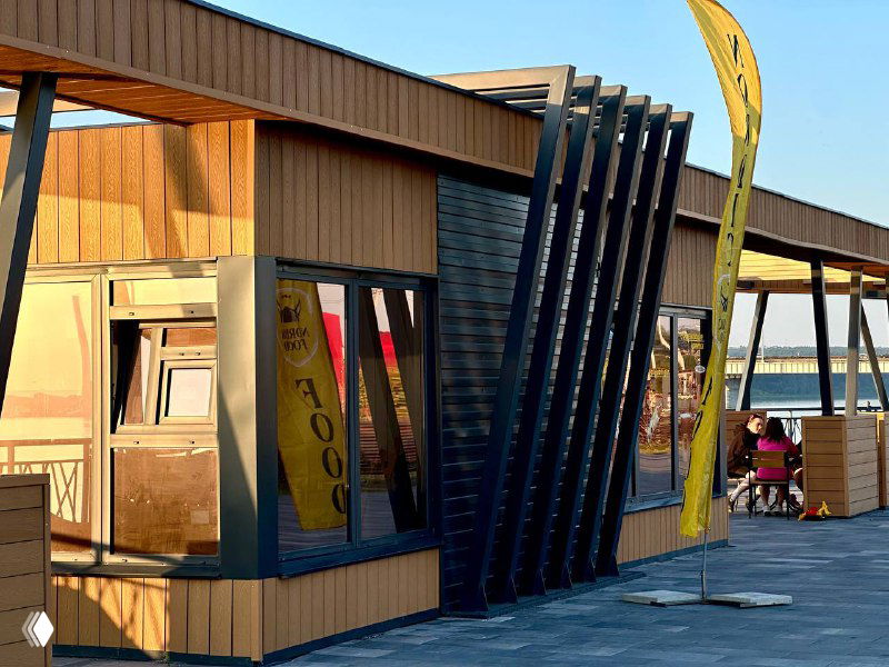 На фото — стильное модульное здание с площадкой, полностью выполненной из ДПК на набережной в Кемерово 😍