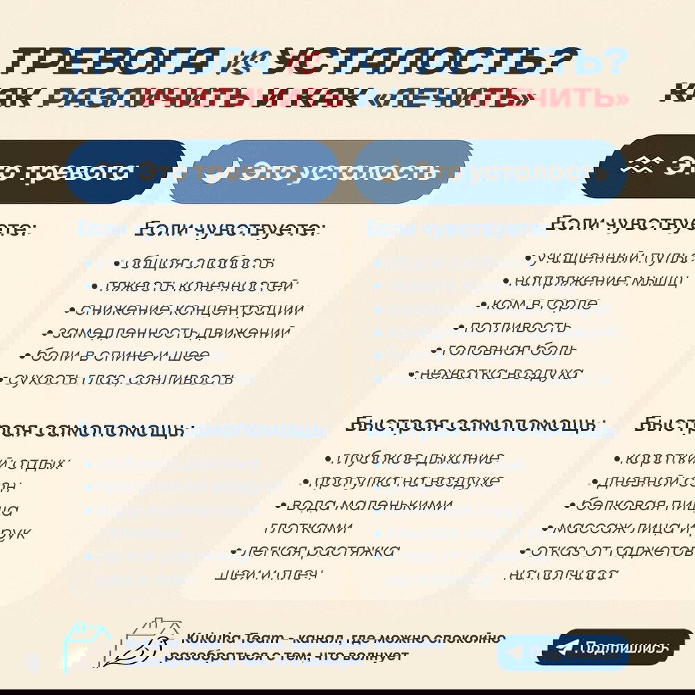 Мы показываем, как отличить тревогу от обычной усталости и не ругать себя за паузы. Даем простые шаги на «сейчас» и «на потом». Никакой драматизации — только ясность и бережность.