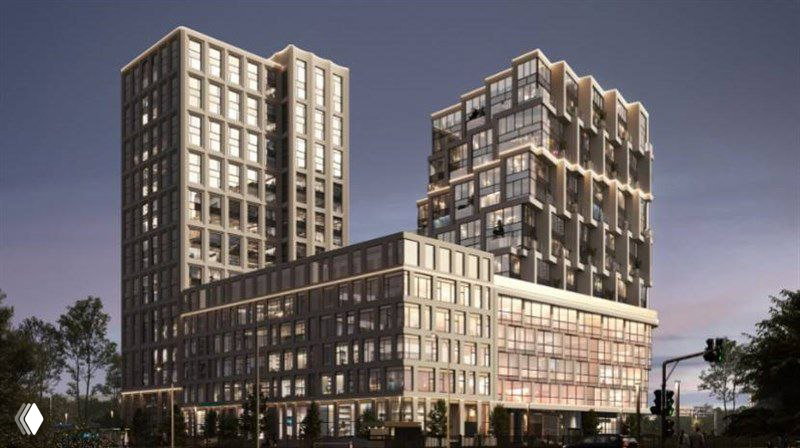 Современный жилой комплекс у воды в вечернем свете — высокие корпуса с витражными окнами и зелёными насаждениями.