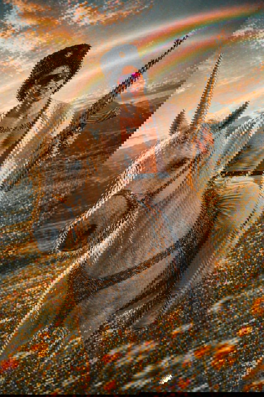 Фон — бескрайнее зелёное поле с яркими полевыми цветами, трава и цветы вокруг ног. Общая стилистика — high-quality editorial fashion photography с элементами dreamcore и сюрреализма.