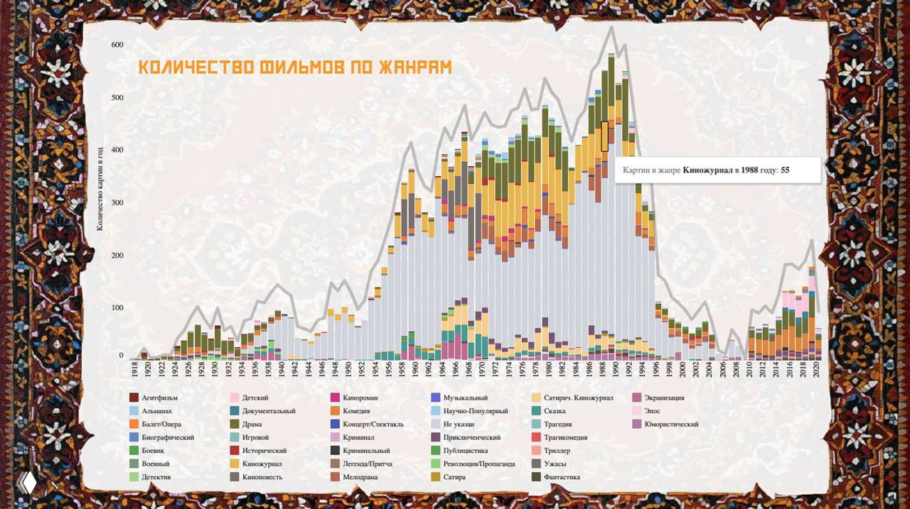 Любовь Поповец сделала дата-исследование на тему советского кинематографа. Она изучала, как в разные годы политические и социальные перемены влияли на количество выпускаемых фильмов в разрезе жанров. Результаты она представила в виде наглядных диаграмм