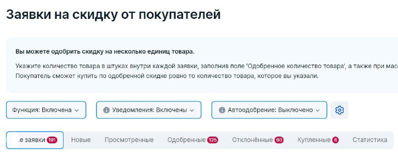 Так вот скрин с площадки Озон показывает что даже принудительная рассылка в обе стороны предложений о скидке имеет слабый эффект: из 125 одобренных заявок выкуп сделали только 6 или 4,8%.