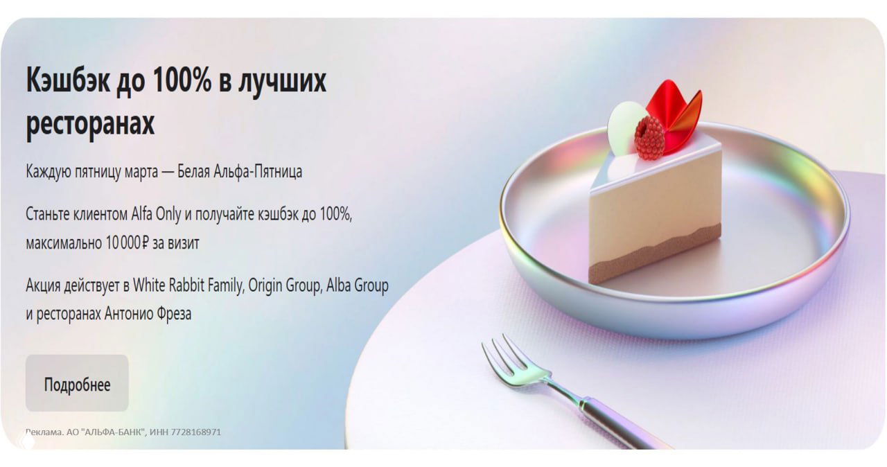 ⚡️Альфа-Банк проводит акцию - вернёт кэшбэк 100% премиальным клиентам (макс 40'000₽ - Alfa Only / 80'000₽ - А-Клуб) за оплату от 2500₽ в ресторанах по пятницам 6, 13, 20, 27 марта.
