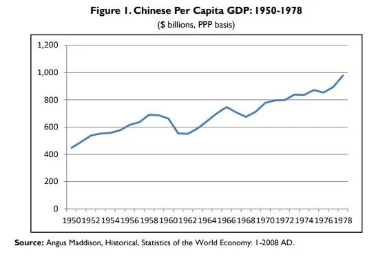 При Мао ВВП Китая по паритету покупательной способности на душу населения (то есть на одного человека) вырос примерно в 2,5 раза: с чуть более 400 долларов США в начале 1950-х годов до почти 1000 долларов США в 1978 году. Эти цифры не из «коммунистического источника», они взяты из отчета Исследовательской службы Конгресса США.
