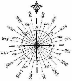 - Красивая традиционная система отсчета - румбовая. Вся окружность видимого горизонта поделена на 32 румба (каждый по 11,25 градуса). Эта система до сих пор используется при передачи прогнозов погоды. ("Ветер Норд Вест (NW), позднее Вест (W) - пример передачи информации в рубовой системе). Сегодня можно услышать основные и четвертные румбы (N, NW), реже трехбуквенные (NEW - норд норд вест), и почти никогда уже не встречаются промежуточные (NtW - норд тень вест). Но система красивая).