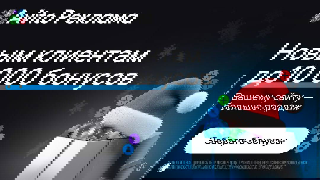 А еще новым клиентам Авито раздает бонусы в кабинете. Просто регистрируетесь до конца акции, пополняете баланс, а Авито начисляет до 10 тысяч бонусов — на них запускаете рекламу и получаете клиентов.
