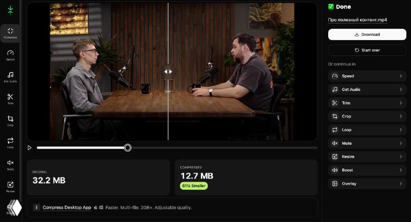 Вообще раньше этот сервис работал как просто «сжиматель» видео. Очень качествено и быстро он круто снижал вес роликов и делал это в вебе. Да, с потерей качества, но вебинары уменьшал очень хорошо и почти без деградации картинки.
