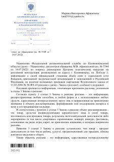 «Таким образом, изучив представленные материалы и сведения, принимая во внимание разъяснения ФАС России и заключение Рекламного совета, Калининградское УФАС России приходит к выводу, что указание на рассматриваемой рекламной конструкции официальной страницы в социальной сети Instagram по своей сути не является рекламой, соответственно, не подпадает под регулирование Закона о рекламе.»