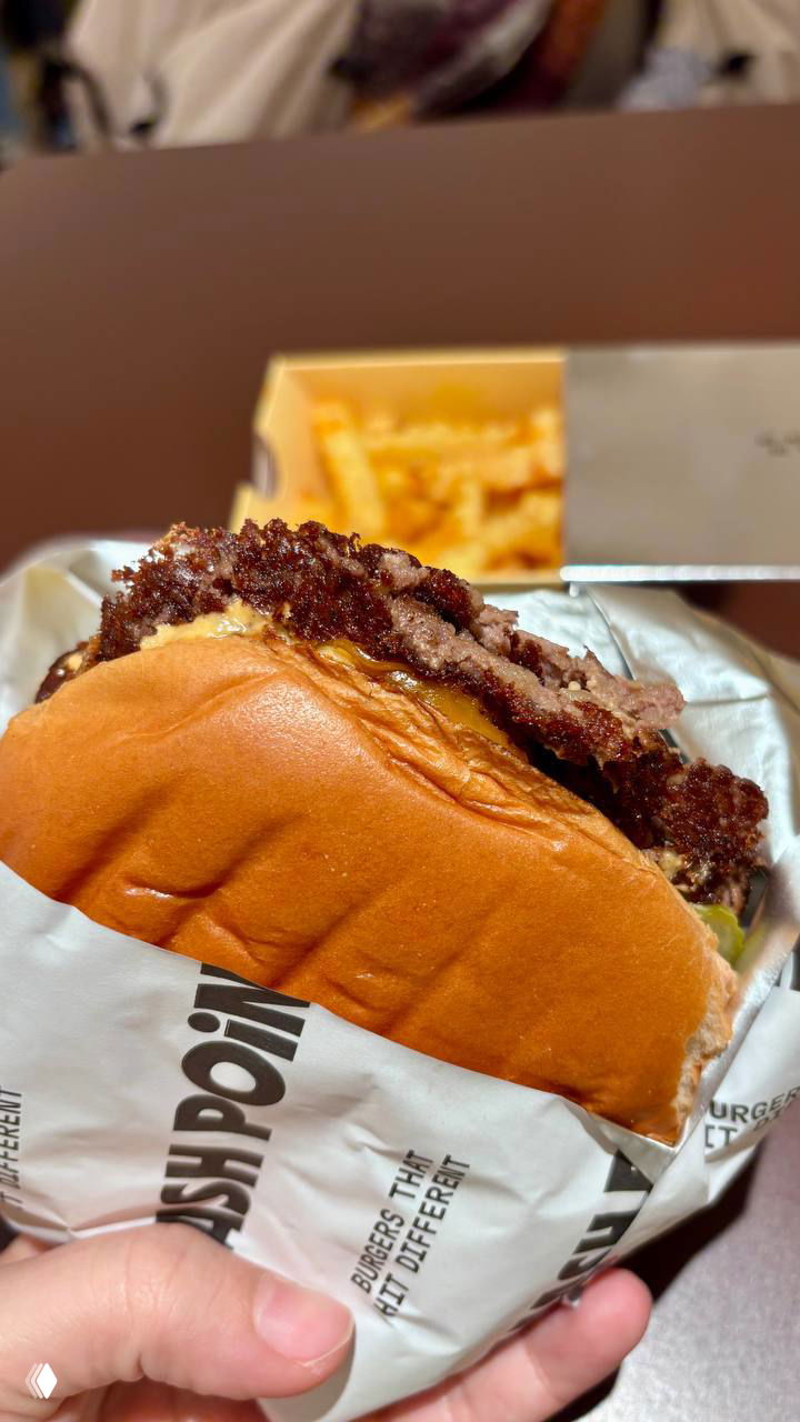 Smash Point. Ребята явно перехайповали. Бургеры суховаты, сильно соуса не хватает, очередей точно не стоят. Ну и минимальное количество котлет в бургере — 3 (Карл!) — это жесть. Да, тонких, но все равно хочется варианты поменьше. А вот картошка 10 из 10, прям шикарная. Упаковка и стиль тоже крутые. Но все-таки чтобы захотелось вернуться, именно главный продукт, бургер, должен того стоить.