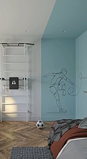 - ⚽ Голубым цветом и росписью на футбольную тематику мы выделили спальную зону. Основная часть комнаты решена мебельной композицией с продуманным функционалом на все случаи жизни.