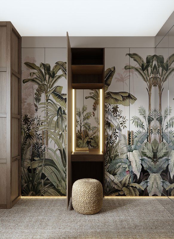 Гардероб представляет собой коридор из шкафов с расписными тропиками, среди которых скрывается "макияжный отсек" с зеркалом, подсветкой и пуфом - все под рост хозяйки бунгало👌🏻