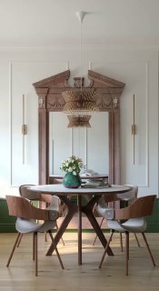 - 🌲 Зона кухни своей цветовой гаммой отсылает нас к зимнему лесу. Столовая группа, как центр композиции, расположена на пересечении осей окна и шикарного зеркала в резном обрамлении.