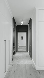 Как известно, от длиннющего коридора в этом проекте нам избавиться не удалось, поэтому недостатки планировки мы скрывали решениями настоящего сурового практика! А именно, при помощи оформления стен, мебели и зонирования цветом.