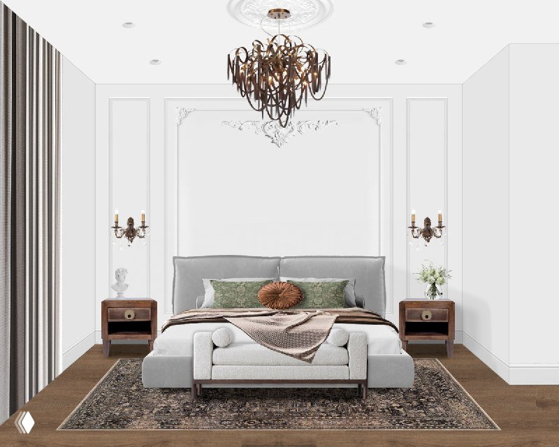Стена за кроватью от Parfе оформлена ажурной лепниной и Итальянскими бра от Lucia Tucci. Индийские прикроватные тумбочки, выполненные из массива, привносят брутальности в элегантную светлую спальню. Композицию завершает эффектная люстра от Jdeon light, которую мы дополнительно выделили потолочной розеткой 💡