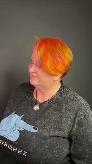 Взяла более стойкие красители в этот раз, посмотрим, как будут себя вести. И стрижку тоже чуть решили поменять. В остальном — все как всегда, рыжий и яркие блоки :)