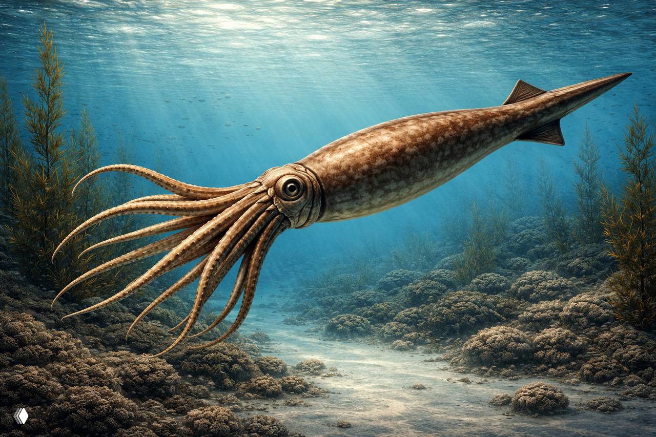 (с греч. «метательный снаряд») - древние головоногие моллюски, внешне похожие на кальмаров, жили в морях примерно 230–66 миллионов лет назад. У них было вытянутое тело, щупальца и внутренний «скелет» - ростр, похожий на каменный наконечник. Питались они мелкой рыбой и ракообразными, активно охотясь в толще воды 🌊