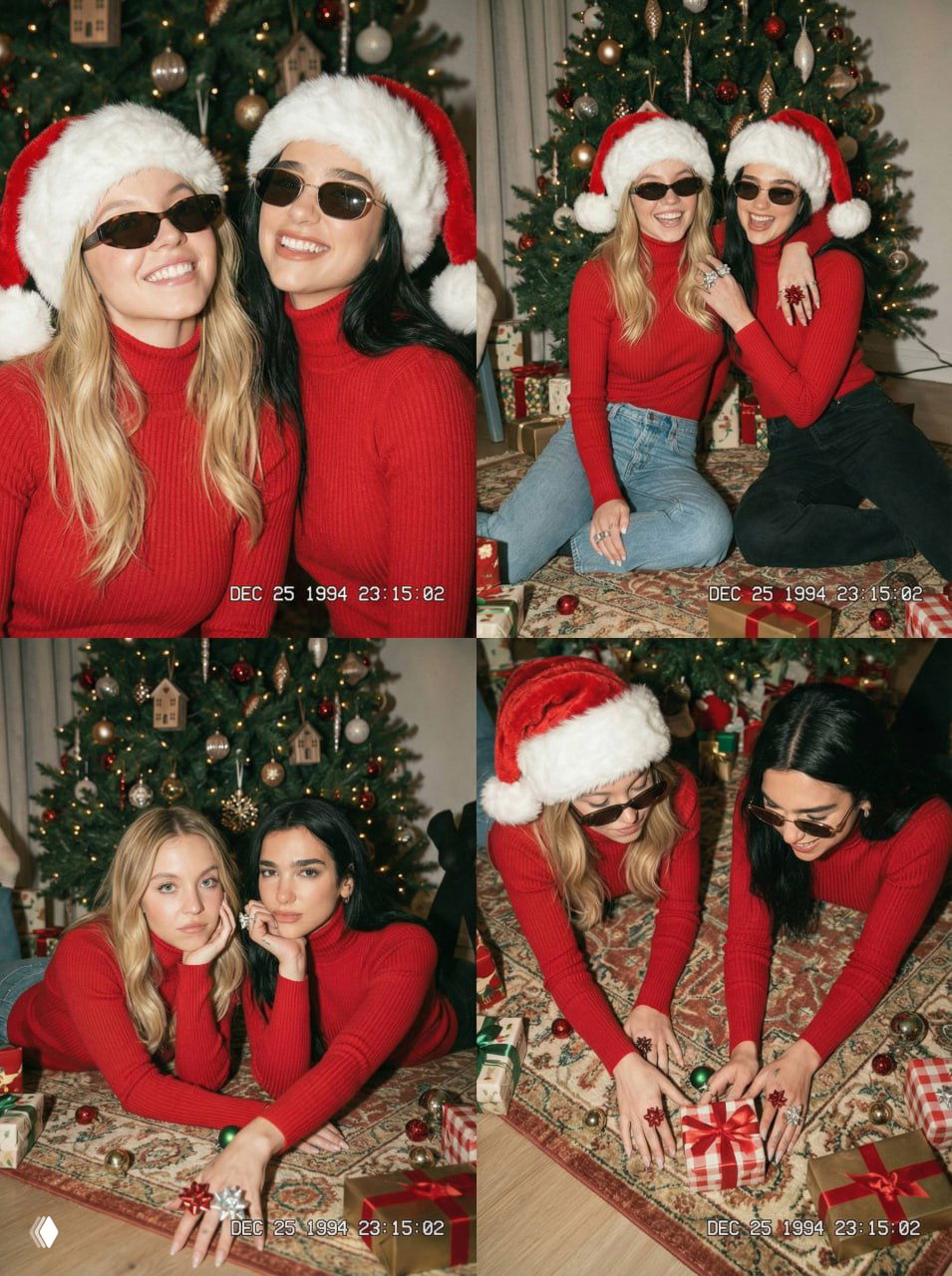 [Обе модели] сохраняют расслабленную, слегка скучающе-ироничную мимику, одна опирается щекой на руку, другая свободно вытягивает руку вперёд, подчёркивая украшенные пальцы. шапки Санты ярко-красные с пышным белым меховым отворотом, свитера плотно облегают фигуру, создавая цельный красный силуэт.