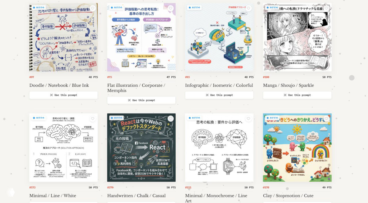 Энтузиасты собрали более 300 проверенных промптов для генерации визуальной графики (диаграммы, блок-схемы и т.д) с конкретными примерами.
