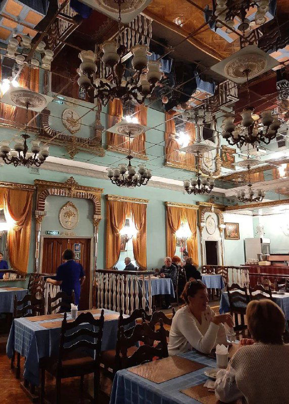 В Центральном доме учёных на Пречистенке работает необычная столовая: лепнина, позолота, винные ковры и хрусталь — всё, как в настоящем дворце. А вот цены совсем не дворцовые: полноценный обед обойдётся примерно в 400 рублей.
