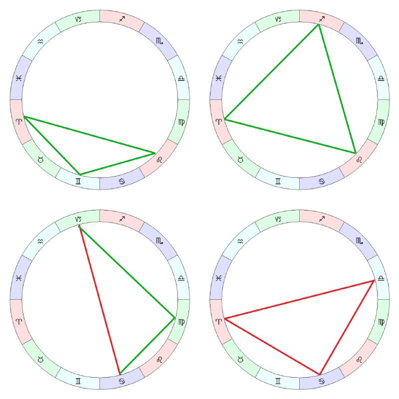 ➖Большой трин — тоже выглядит как треугольник. Состоит из трех тригонов по 120°. Указывает на одаренность, ярко выраженную способность, талант.