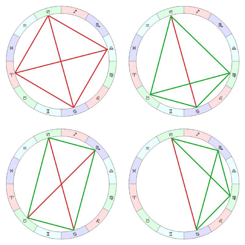 Но в отличие от тау-квадрата, эта фигура мягче — она дает возможность разрешить конфликты оппозиций за счет гармоничных аспектов.