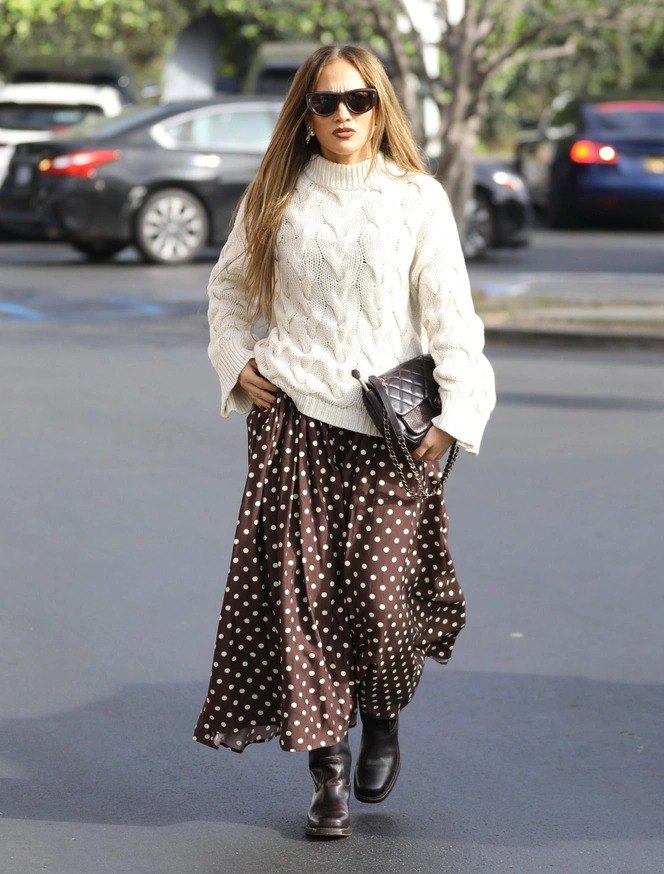 Оно отлично вписалось в зимний образ с уютным белым свитером крупной вязки. Трикотаж добавляет тепла и объёма, грубые кожаные ботинки «приземляют» романтичный принт, а тёмная сумка делает образ достаточно собранным, чтобы в нём можно было отправиться и на новогодний шопинг, и на деловую встречу.