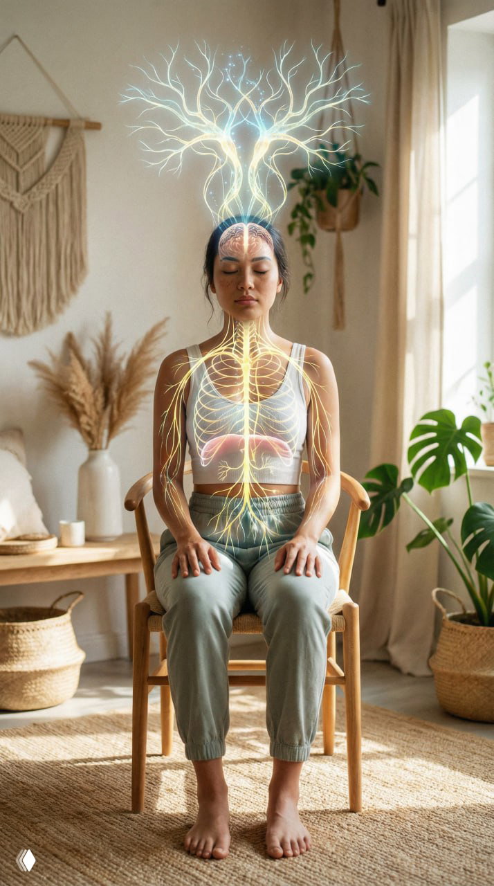 Исследование 2025 года (JAMA Network Open) с участием 400 взрослых показало: медленное дыхание (6 вдохов в минуту, выдох длиннее вдоха) снижает систолическое давление на 8–10 мм рт. ст. и уровень тревоги на 35% за 5 минут. Механизм: активация блуждающего нерва, который передаёт сигнал «всё спокойно» от диафрагмы к мозгу.