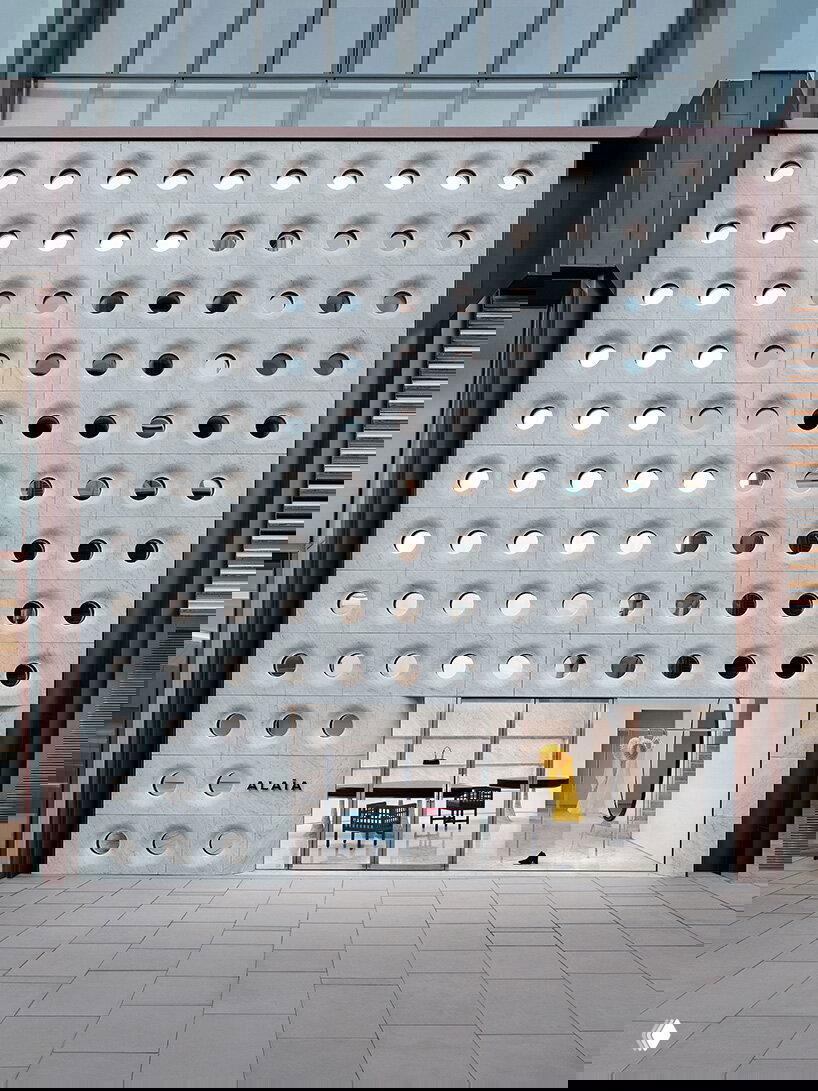 Фасад бутика представляет собой монолитную поверхность из каррарского мрамора. В камне выполнены круглые и овальные окна — этот элемент отсылает к характерным перфорированным мотивам, которые часто встречаются в дизайне Alaïa.