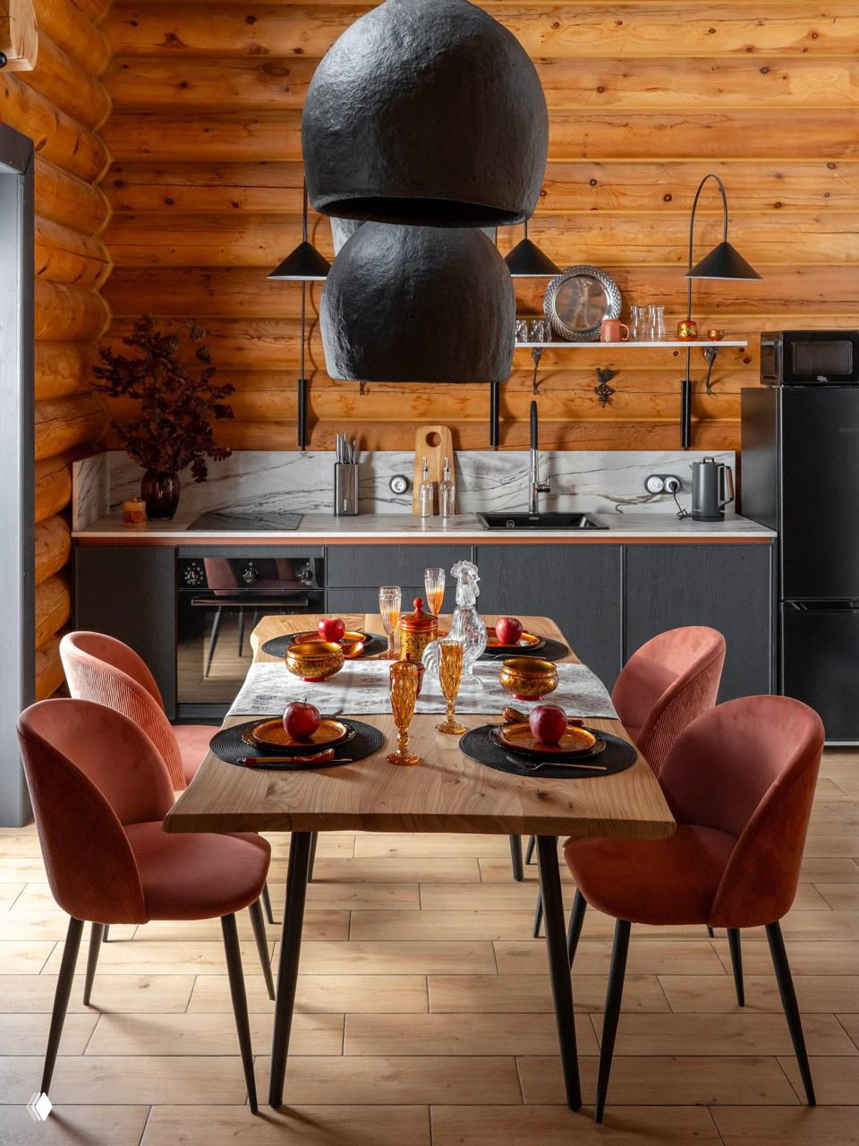 В основе интерьера, конечно же, натуральные материалы: стены — из кедрового бревна в теплом естественном цвете, его рельеф подчеркнут мягкой подсветкой. Пространство построено на контрастах, причем не только материалов, но и стилей: теплое дерево сочетается с графитовыми акцентами, традиции — с современностью.
