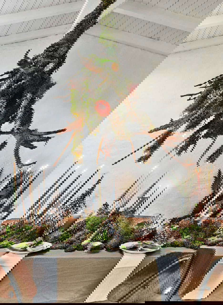 Главным акцентом в этом году стало большое украшение из природных материалов над обеденным столом. Малу называет свое творение «старым пнем, поросшим мхом». Эти же мотивы декоратор продолжила и в декоре праздничного стола: вместо тканевой дорожки выложила горки мха, шишек, сухих бутонов.