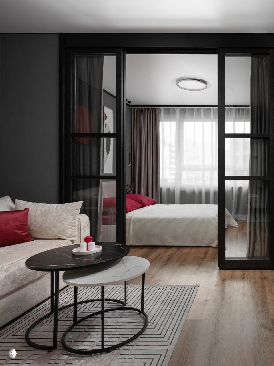 Квартира готовилась под сдачу, и задача была предельно практичной: создать яркое, стильное и запоминающееся пространство, выстроив его на износостойких решениях. Так что на полу — SPC-плитка под дерево, устойчивая к влаге и механическим повреждениям, а углы защищены металлическими профилями — они не только практичны, но и создают ощущение «собранности».