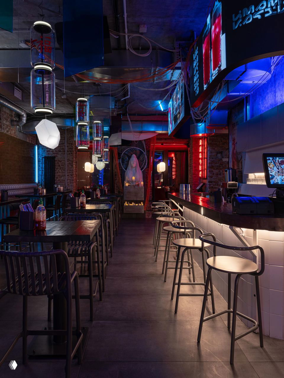 Основатели бюро «Неарт» Николай Гилев и Анна Коротких создали кибер-интерьер с атмосферой японских улочек. Стиль интерьера нового кафе можно назвать кибер-Азия. Дизайнерам хотелось создать образ города будущего — имитацию того, что гость находится не в помещении, а где-то между домами, среди проводов, граффити и старых кондиционеров. Эффект усиливает неоновая цветовая гамма.