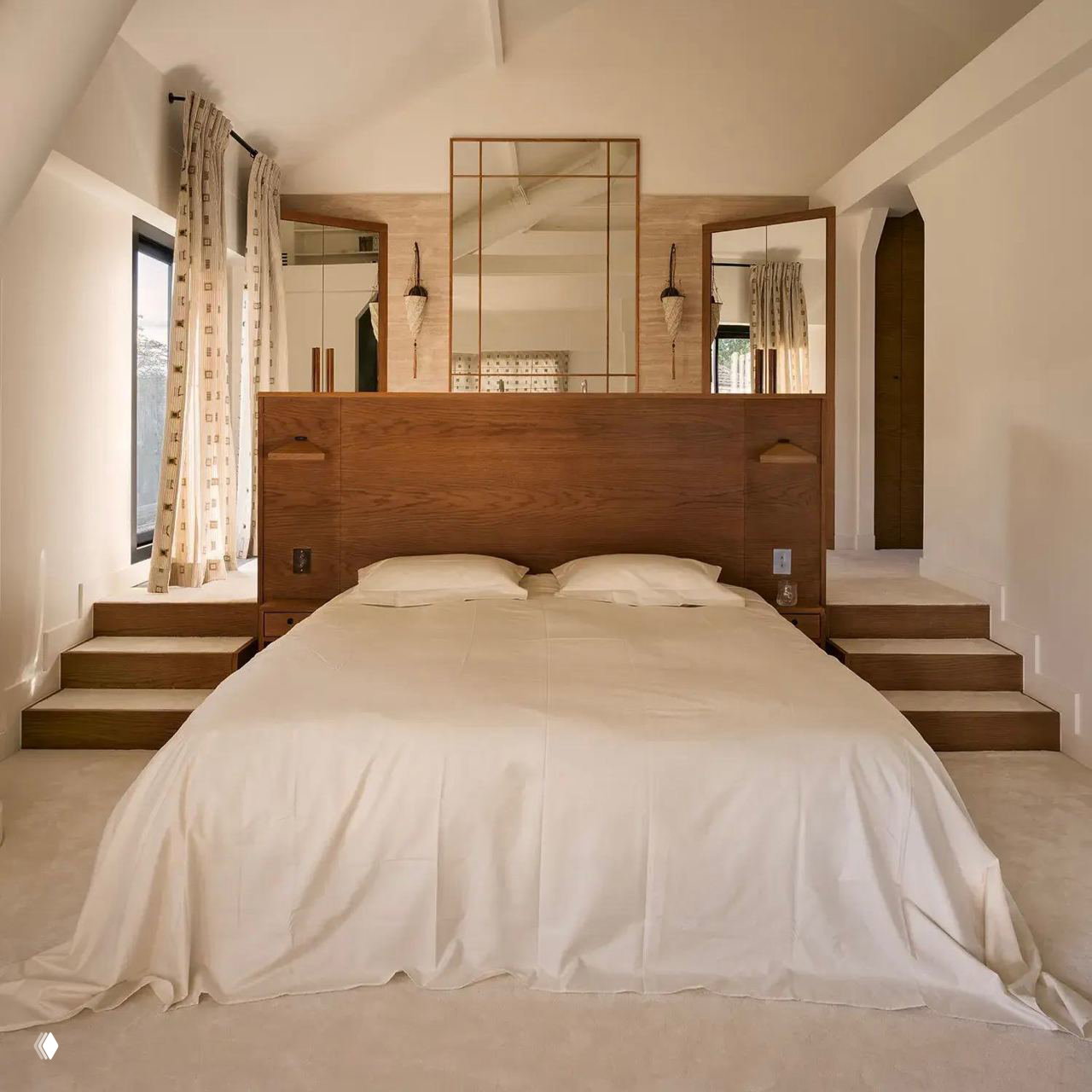 Скажем сразу: для маленьких квартир такое решение не подойдет. Во-первых, при высокой влажности трудно спать, во-вторых, в ограниченном пространстве ванна рядом с кроватью «съест» весь объем и будет смотреться как вынужденное решение.
