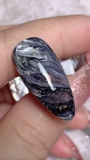 Абстрактный дизайн, напоминающий космическое пространство или загадочные узоры натурального камня. 🪐✨ Глубина, мерцающие частицы и плавные разводы создают уникальный эффект – будто маникюр вобрал в себя целую галактику.