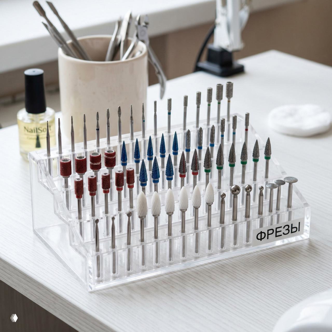 Даже если вы помните цвета насечек наизусть, сделайте себе дополнительные ориентиры. Храните синие фрезы строго отдельно от красных. А еще есть классный лайфхак. Положите на дно ящика белый или яркий силиконовый коврик. На контрастном фоне вы моментально увидите нужную форму носика.