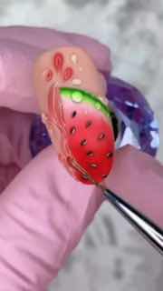 Насыщенные оттенки, реалистичные капли и плавные переходы цвета делают этот дизайн максимально живым и свежим! 🌿🔥 Маникюр с фруктовыми мотивами отлично подойдет для летнего сезона и точно не останется незамеченным.