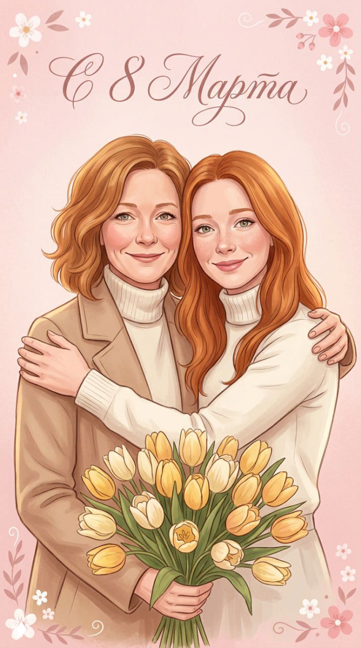 Используй загруженные фото как точный референс внешности мамы и дочки, сохранить лица и узнаваемые черты. Создай иллюстративную поздравительную открытку к 8 марта в мягком живописном стиле. Мама и взрослая дочка стоят рядом, обнимают друг друга за плечи, тёплые искренние улыбки. На переднем плане — букет жёлтых и кремовых тюльпанов. Стиль — аккуратная художественная цифровая иллюстрация с мягкой прорисовкой кожи, лёгкой текстурой бумаги, пастельная палитра (розовый, бежевый, кремовый). Фон — нежный розово-пудровый градиент с лёгкими цветочными декоративными элементами по углам. В верхней части открытки аккуратная надпись «С 8 Марта» изящным каллиграфическим шрифтом. Мягкий свет, тёплая цветокоррекция, высокая детализация, формат вертикальной открытки, праздничное настроение.