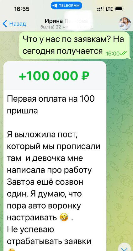 На сегодня получили несколько заявок на работу, одну оплату на 100 тр (одним чеком).