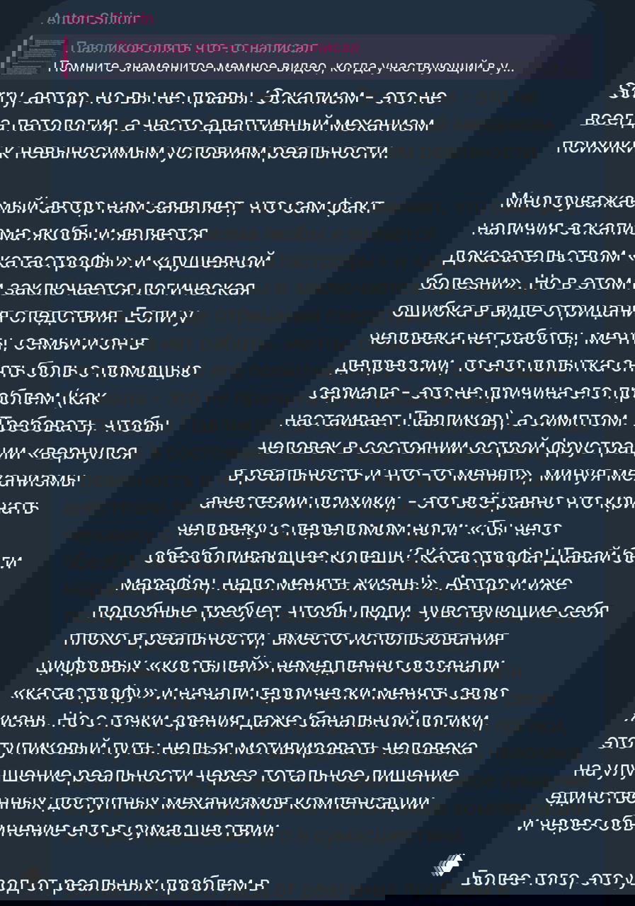 – Сынок, тебе уже 35 годиков. Игры, соцсети, сериалы и порно ты потребляешь по 5 часов в сутки уже 15 лет. Как думаешь, может, ты уже достаточно анестезировал свою ножку и готов заняться ее лечением?