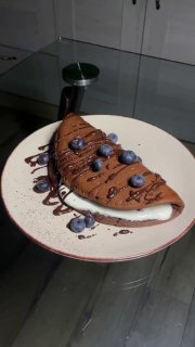 - ❤️Украсить панкейк топлёным шоколадом и голубикой.