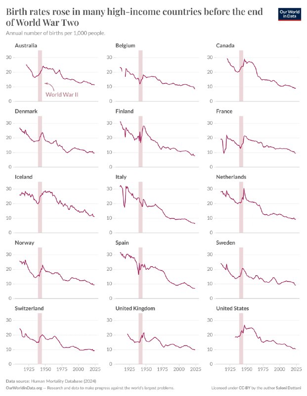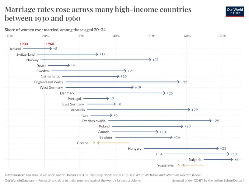 Our World in Data собрали и проанализировали данные по рождаемости и бракосочетаниям, в которых видно проявление беби-бума. На графиках: