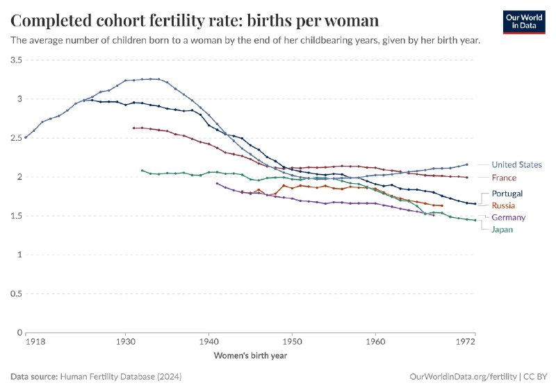 - — Среднее число детей, которое родили женщины одного поколения к концу фертильного возраста (≈49 лет). По горизонтали указан год рождения, по вертикали — среднее число рождённых детей