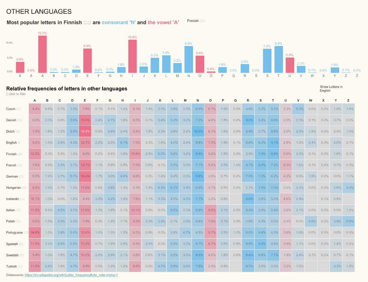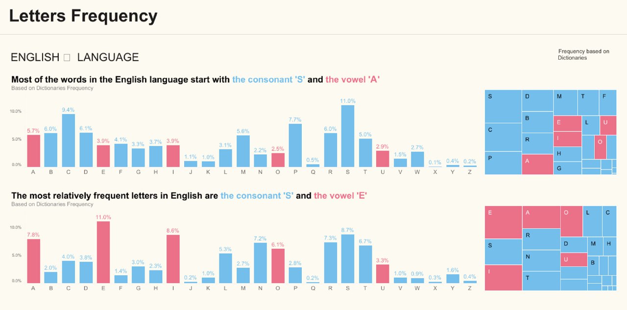Чаще всего в английском используются буквы S и E, больше всего слов начинаются с S и A. Самые популярные буквы в других языках: