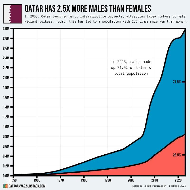 В Катаре сильно больше мужчин из-за массовой трудовой миграции. Страна активно строилась и развивалась с 1990-х годов, особенно после начала подготовки к чемпионату мира по футболу 2022 года. Почти весь избыток мужчин — это временно проживающие рабочие, а не граждане Катара. Важно также понимать, что трудовые мигранты практически не имеют шансов стать гражданами — они работают до тех пор, пока есть работа, а потом покидают страну