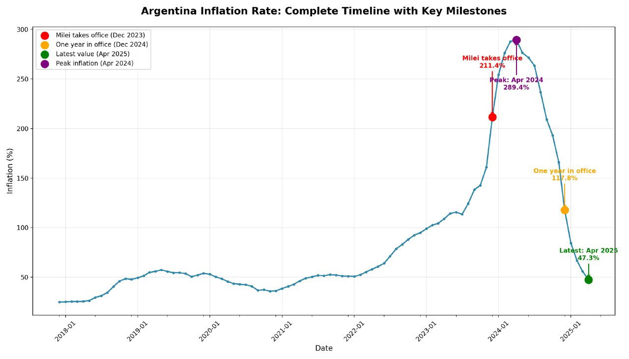 - апрель 2025: инфляция опускается до минимального за последние четыре года значения в 47,3%