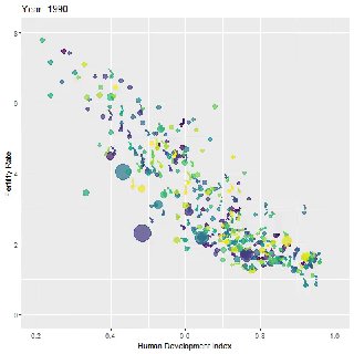 ИЧР указан по горизонтали, рождаемость — по вертикали. Размером кружков обозначена численность населения стран.